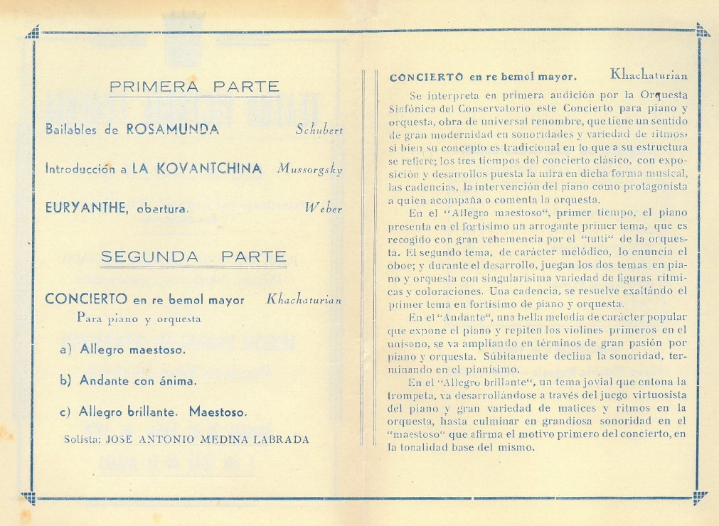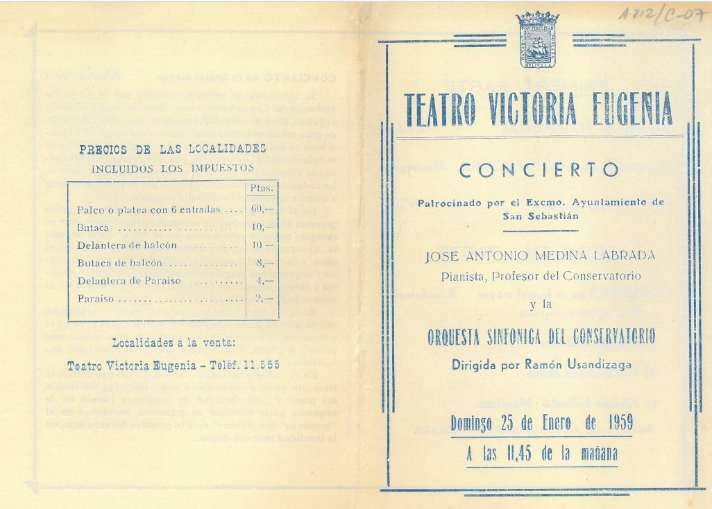 Patrocinado por el Exemo. Ayuntamiento de San Sebastian José Antonino Medina Labrada Pianista, profesor del conservatorio y la orquesta sinfónica del conservatorio, dirigida por Ramón Usandizaga